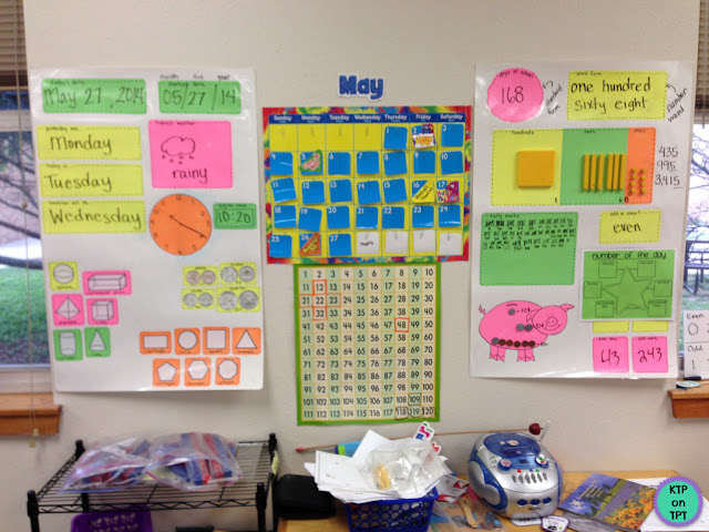 My set up doesn't look like this every year (depends on what my classroom space looks like), but I do always include a monthly calendar board, a 120 chart, and my two Calendar math posters. I made them several years back when I had a student teacher. During her 'Total Teach' time, I had to spend time out of the classroom so she could be in charge. I did a lot of work for the school and my team, and also got to make my awesome posters!! I also have a digital version of these posters in my store. Check it out