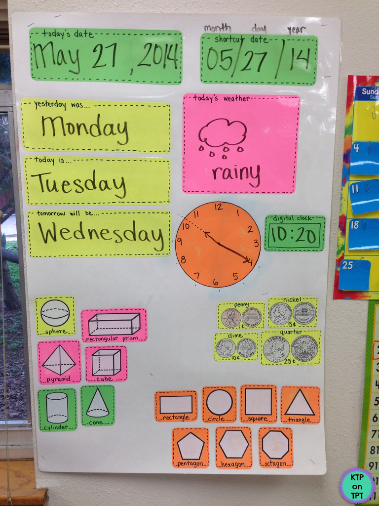 I also included coins, a clock, and a piggy bank on my posters, but we don't hit those every day For money, we review the values of each coin and/or talk about the images on the front and back. We sing the money chant as well, "A penny is one cent, a nickel is five. A dime is ten cents, a quarter 25!" For the shapes, I point out a couple shapes and go over different things each time. I might show them that you can find 2D shapes on the faces of 3D shapes. We might talk about some real life items that match our 3D shapes. I might ask them to come up and count sides and vertices of the 2D shapes. For the clock, we usually would pick a time from our schedule (recess, lunch, Specials) and write that in the digital box and then talk about how it would look on the analog clock.